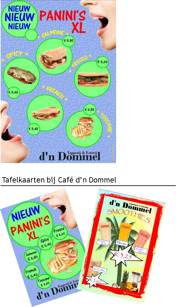 De tafelhouders zijn aangevuld met kaartjes (10x15) met de verschillende smaken. Op de achterzijde staan de smoothies die Café d’n Dommel serveert. |