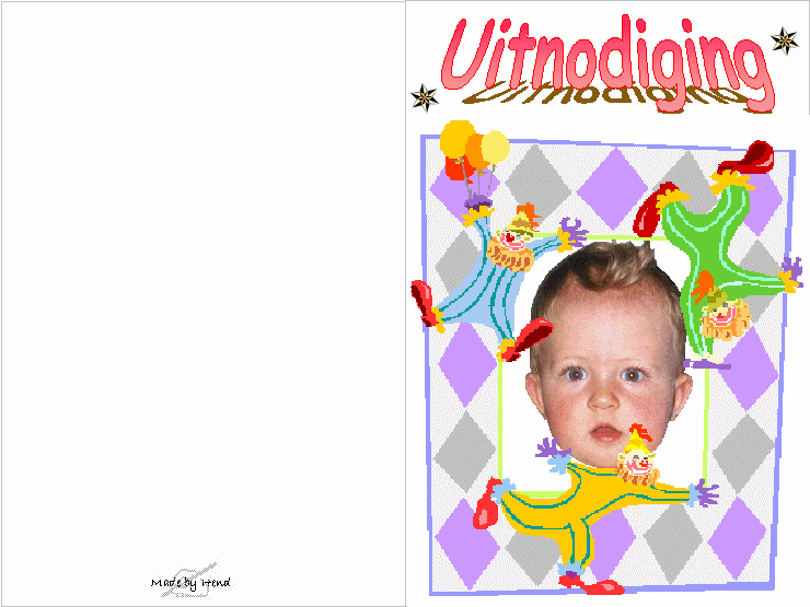 Dit is een opengeklapte uitnodiging, tja de achterkant(links) is niet echt boeiend….De rechterzijde bleek aanzienlijk meer moeite te kosten. Het kader moest natuurlijk transparent zijn om er een foto in te kunnen plaatsen. De foto zelf is ook uitgesneden en zo secuur mogelijk heb ik zitten ‘gummen’ in PaintShopPro. |