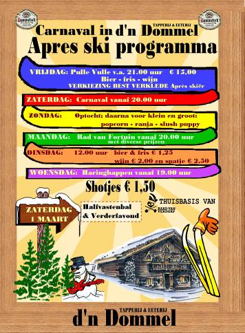 Dit jaar heeft Café ‘t Dommeltje als Carnavals-thema Après Ski. Deze poster is op diverse formaten gemaakt (A0, A3 en A4)